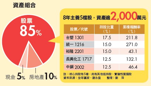 謝永盈運用這套養股術,到2006年,光台塑1檔股票,含配股已累積超過50張,成為他的第1大持股。「從這一年開始,我每年領的股利就超過70萬元,所以,我不再投入薪水,光用股利再投入就夠買了!」他說。